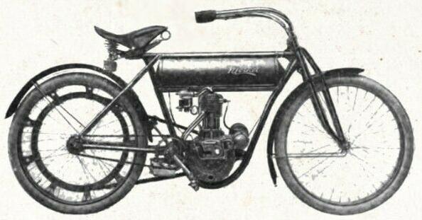 1906 (new motor, the carburetor throttleis operated by the grip control on the handle bar, low rubber protection on the front mudgard, air pump in front of the rear wheel)