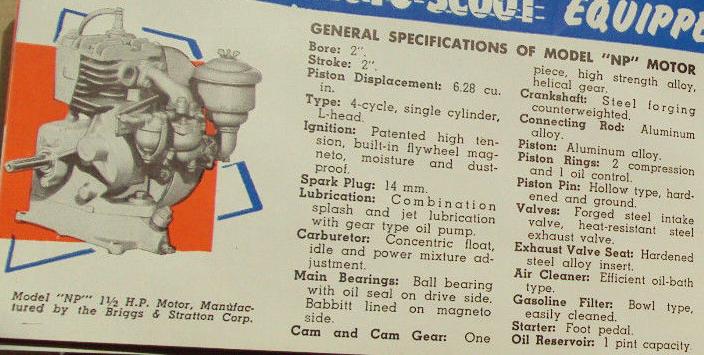 1945 Model 445 solo, 1,5hp Briggs & Stratton NP motor, 6,28 cu.in. (103,0cc), bore 2", stroke 2", 2-speed transmission