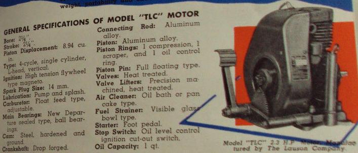 1945 Model 245 solo, 2,3hp Lauson TLC 320 motor, 8,95 cu.in. (146,6cc), bore 21/4", stroke 21/4", Amsco clutch