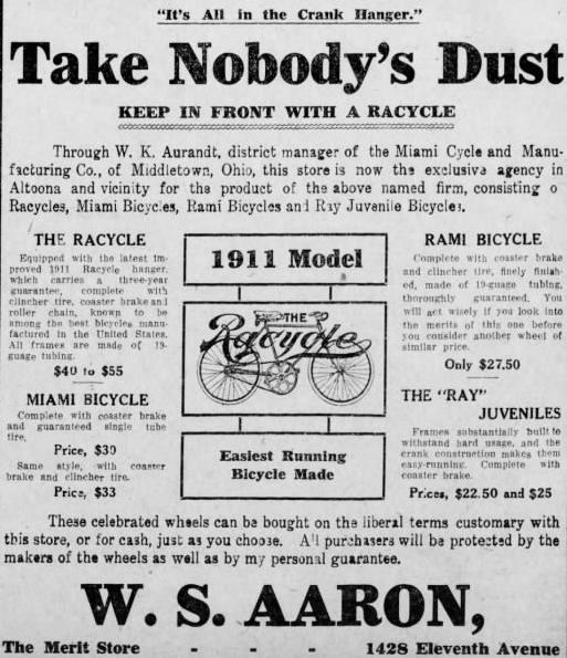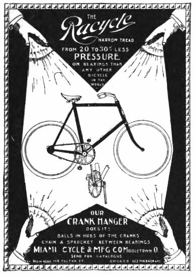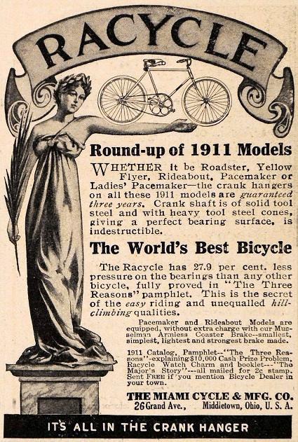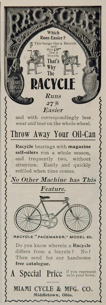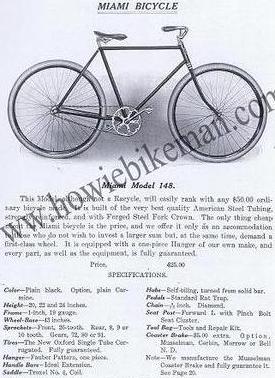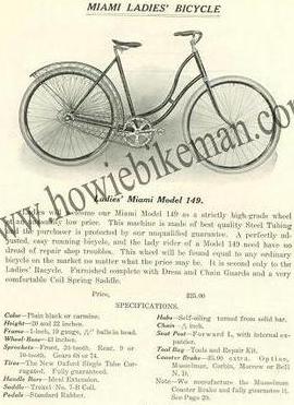 Miami Cycle & Mfg. Co., organized in 1894, produced following bicycles: Miami (1896-1912-?), Hudson (1896-1914), Musselman (?), Ray (1910-1911), Rami (1911), Ramie (1912-?), Racycle (1896-1924).