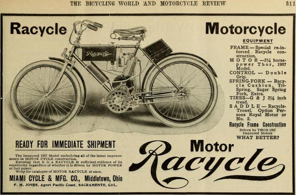 Miami Cycle & Manufacturing Company, famous bicycle maker, began its motorcycle production with assembling the clone of Indian "Camelback" using complects produced by the Aurora Automatic Machinery Co.. The only difference from Indian was big-letter RACYCLE name on the battery.