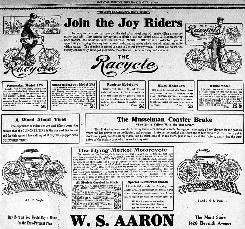 In 1911 Miami Cycle & Mfg. Co. bought The Flying Merkel trademark, one of popular motorcycle makes. For 1912 season Racycle name remained only for bicycles, and motorcycles have been produced under The Flying Merkel trademark only.