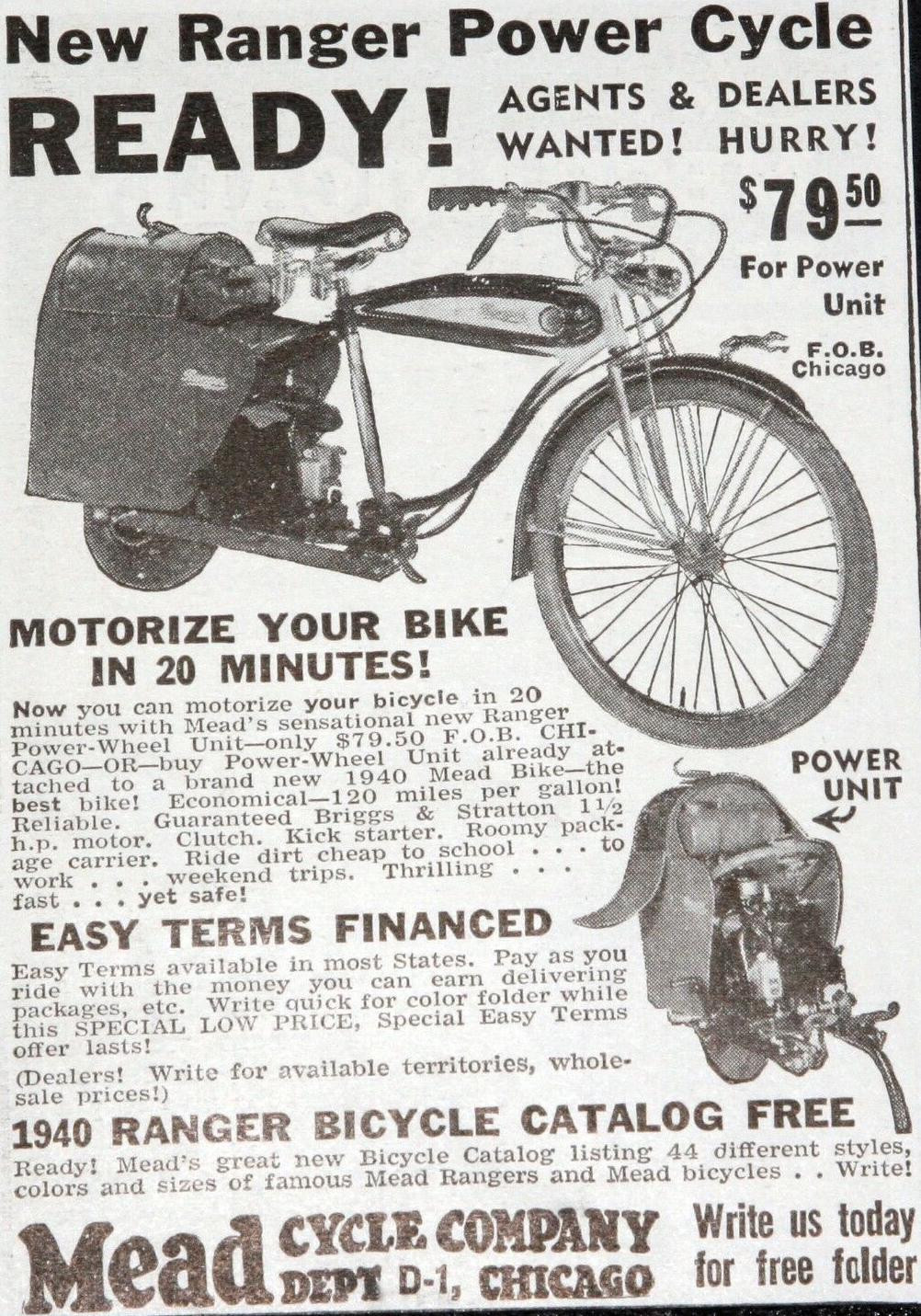 1939-1940 Ranger bicycle with power unit, 11/2 hp, Briggs and Stratton motor, 324k 1939 poster