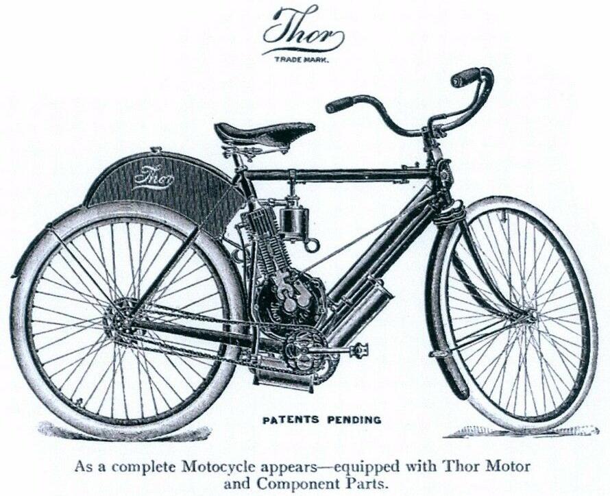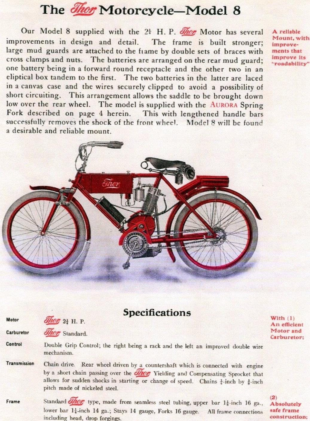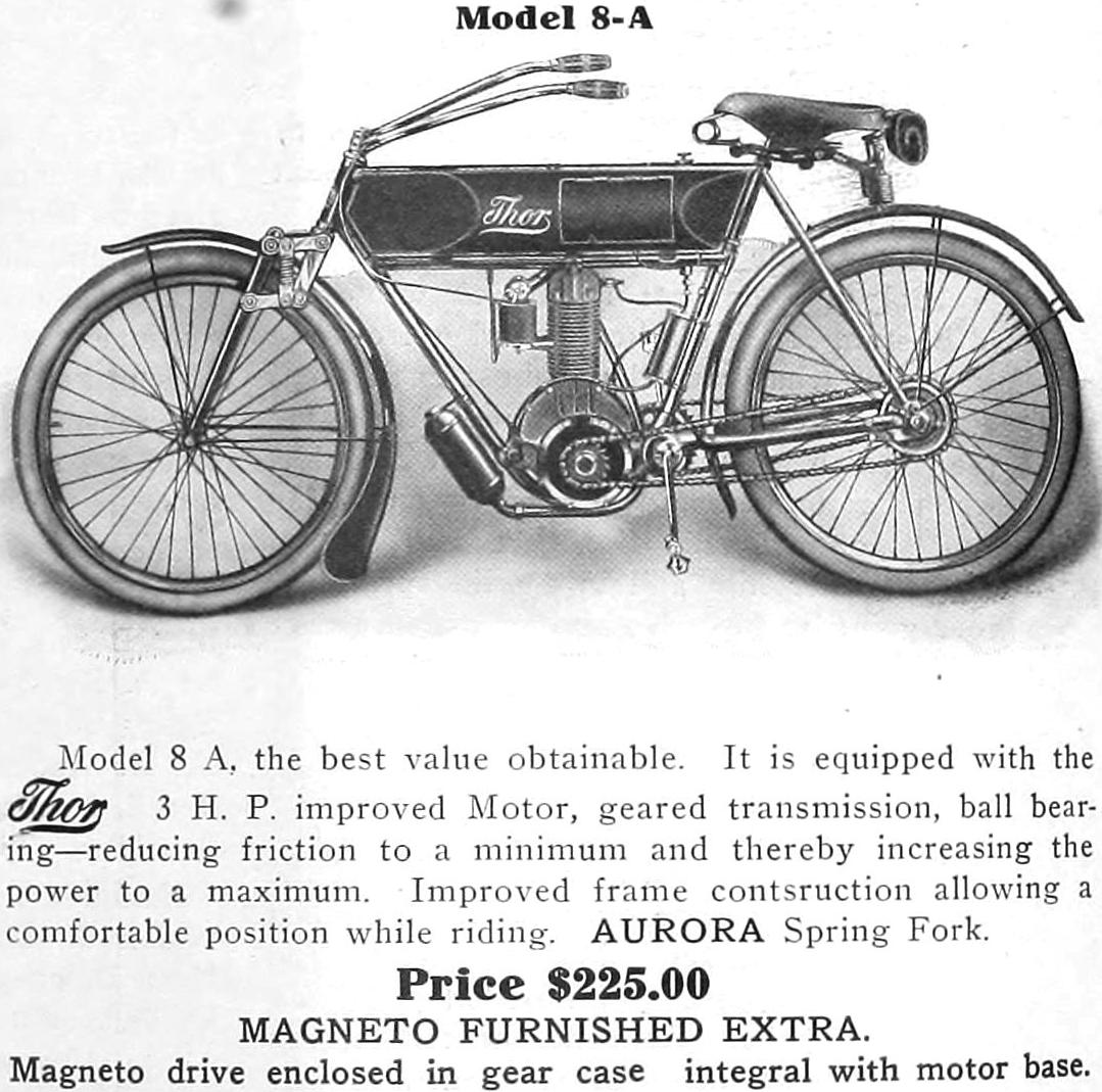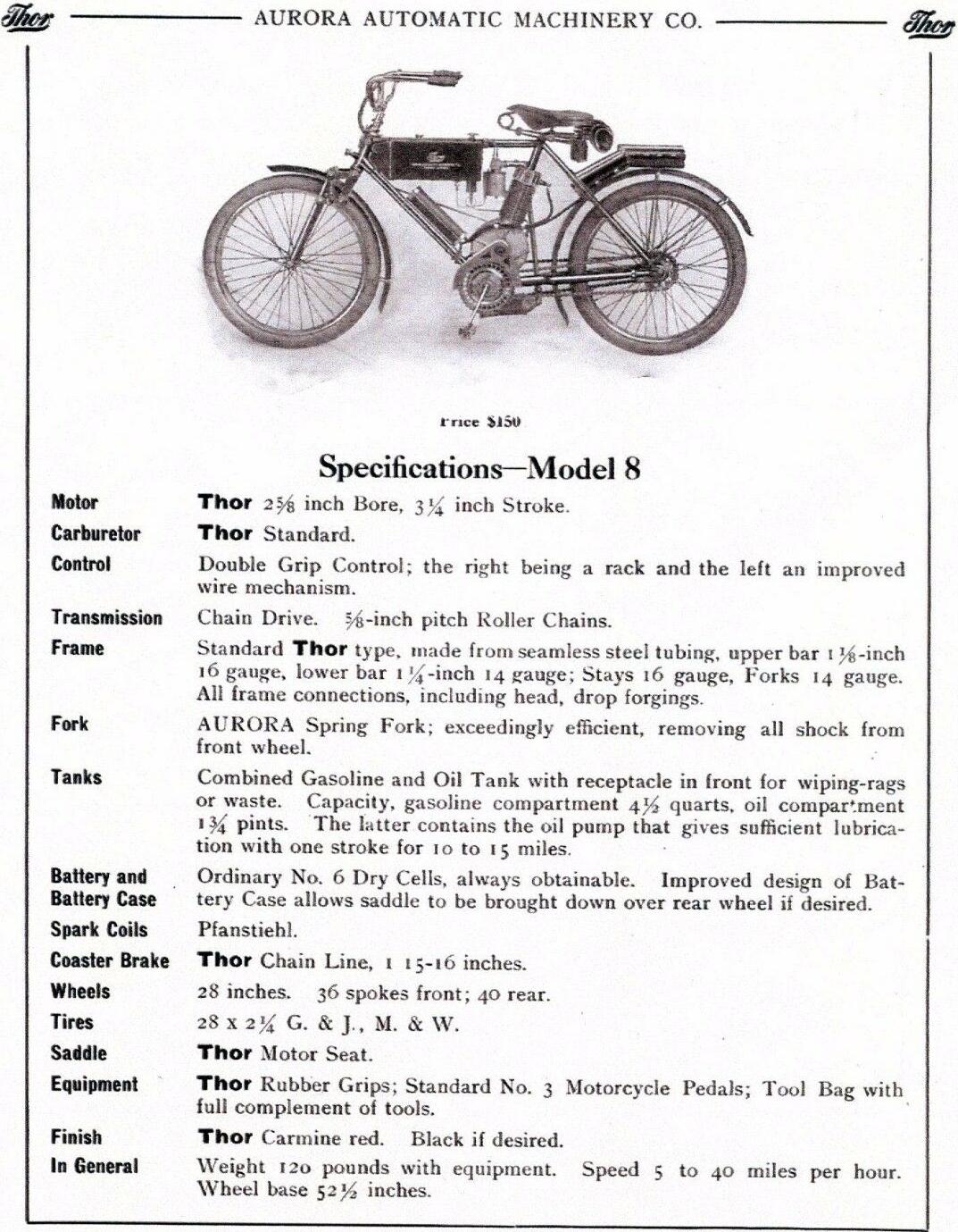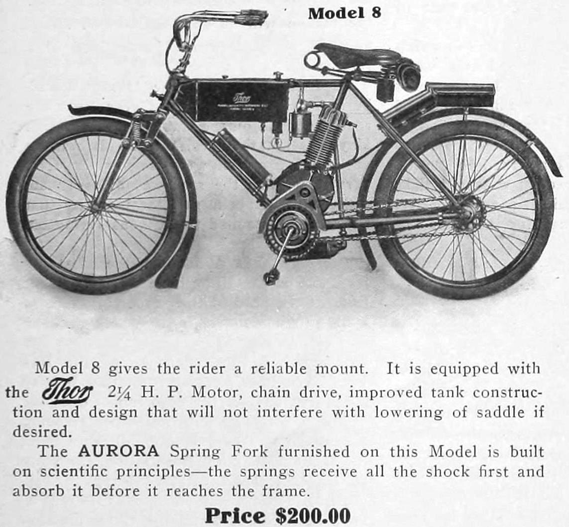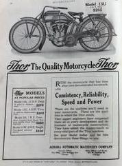 Aurora produced units for bicycle companies. Since 1902 Aurora built all the engines for early Indian motorcycles. In parallel Indian allowed Aurora to built their motors for side-producers of motorcycles. By 1903 Aurora produced all the necessary for complete motorcycle (clone of Indian), but advertised Thor motorcycles with record that complete Thor motorcycle assembled from our units should look so. Formally Aurora didn't assemble Thor motorcycles, - this was business of other companies. In 1903-1907 few clones of Indian appeared under trademarks Thor, America, Apache, Crescent, Fowler-Manson-Sherman, Imperial, Manson, Monarch, [Moto-]Racycle, Rambler, Reading Standard, Light and [Light] Thor-Bred, Thoroughbred, Warwick and few years later Emblem, Minneapolis, Sears and Torpedo. In March 1907 agreement between Indian and Aurora was over, and Thor motorcycles were officially advertised.