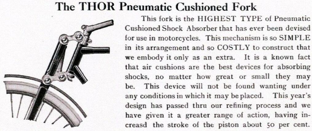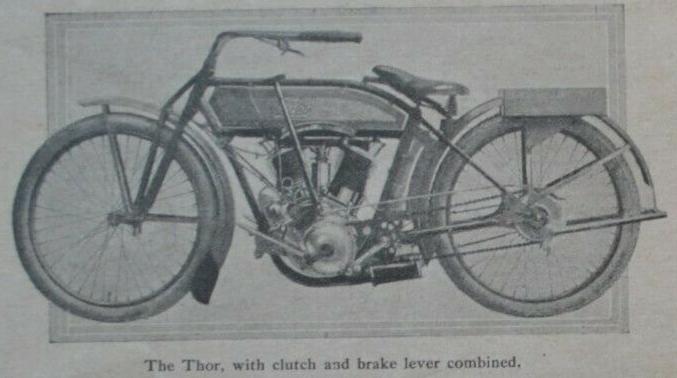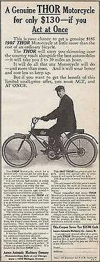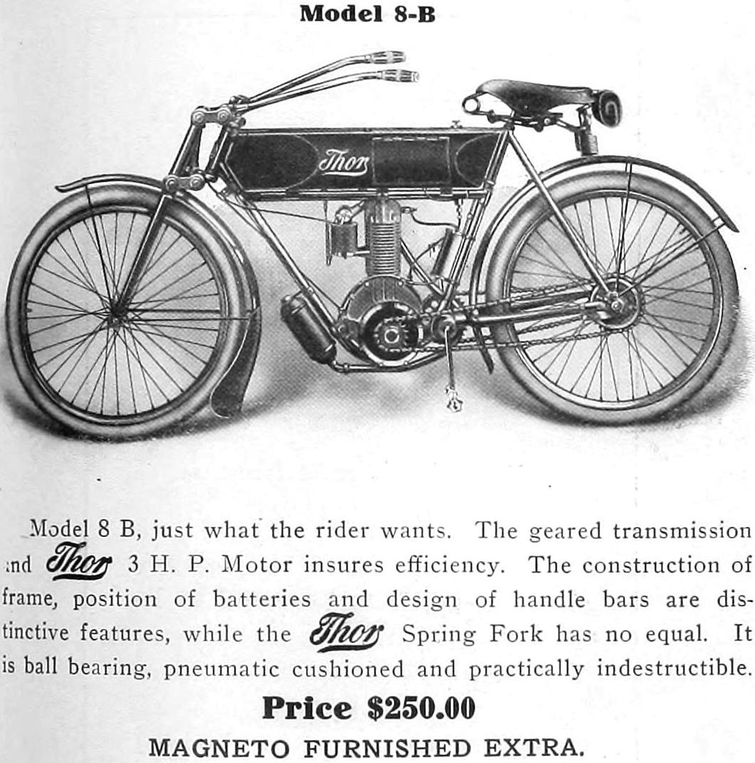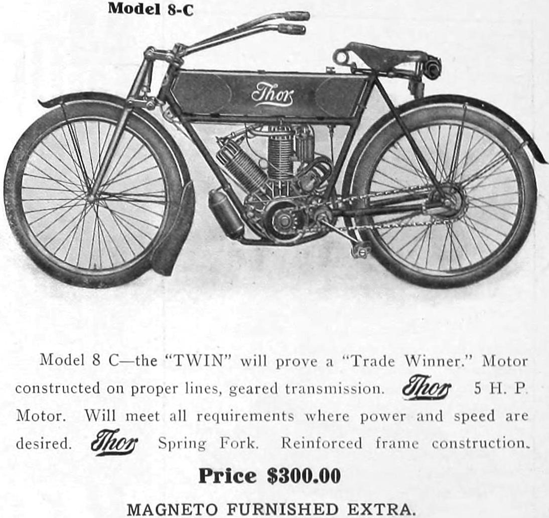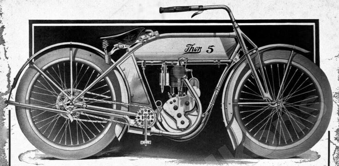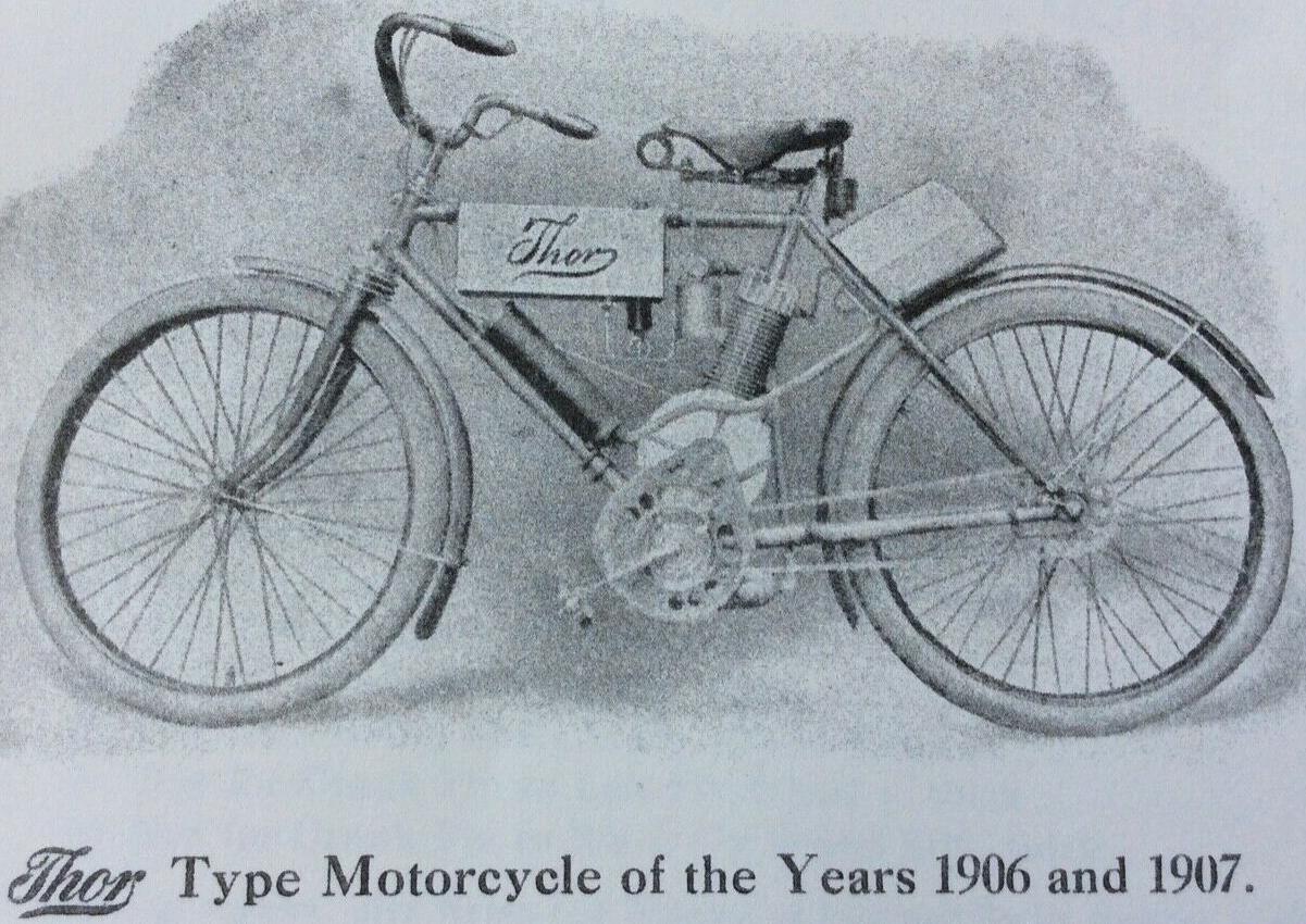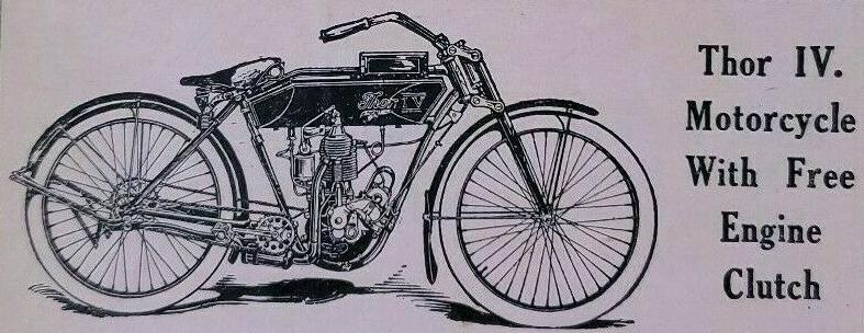 Aurora produced units for bicycle companies. Since 1902 Aurora built all the engines for early Indian motorcycles. In parallel Indian allowed Aurora to built their motors for side-producers of motorcycles. By 1903 Aurora produced all the necessary for complete motorcycle (clone of Indian), but advertised Thor motorcycles with record that complete Thor motorcycle assembled from our units should look so. Formally Aurora didn't assemble Thor motorcycles, - this was business of other companies. In 1903-1907 few clones of Indian appeared under trademarks Thor, America, Apache, Crescent, Fowler-Manson-Sherman, Imperial, Manson, Monarch, [Moto-]Racycle, Rambler, Reading Standard, Light and [Light] Thor-Bred, Thoroughbred, Warwick and few years later Emblem, Minneapolis, Sears and Torpedo. In March 1907 agreement between Indian and Aurora was over, and Thor motorcycles were officially advertised.