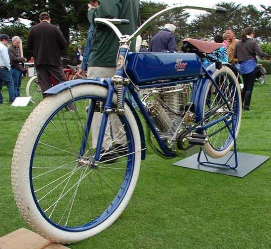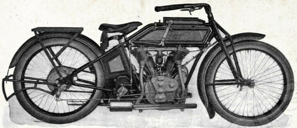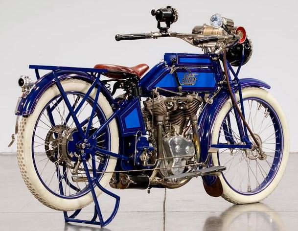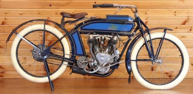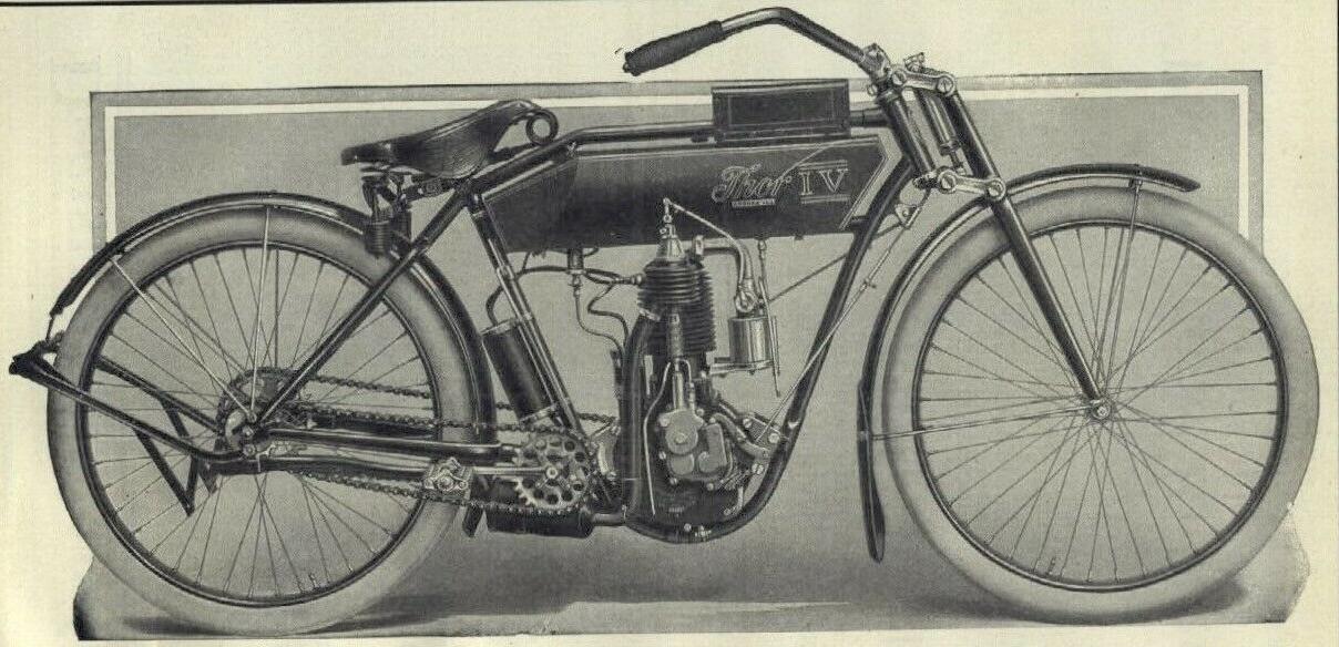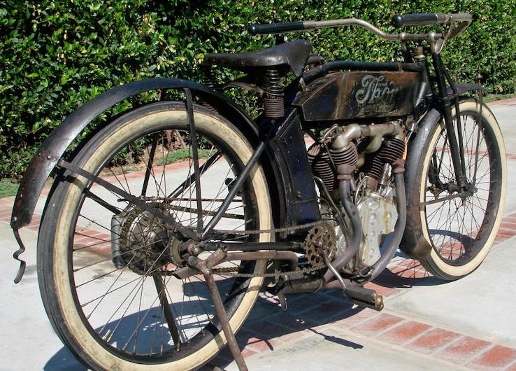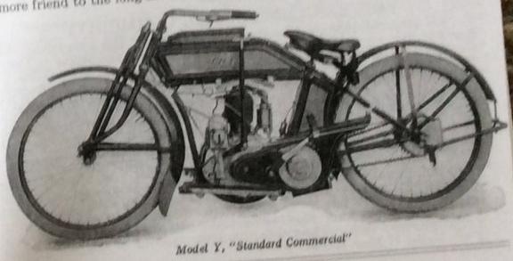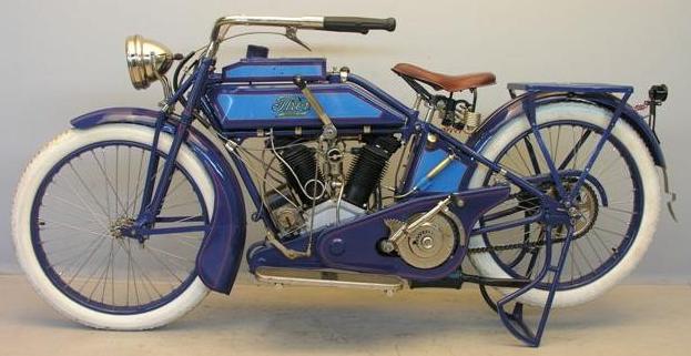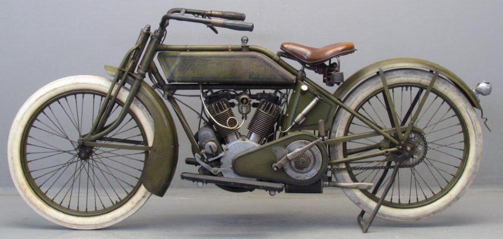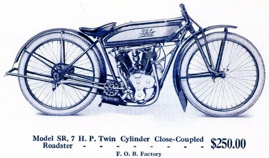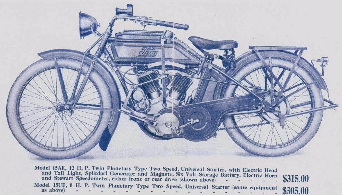 1915 (new: Thor universal starting device, planetary 2-speed transmission with clutch (on the left of rear hub), larger and improved coaster brake, enclosed valves and rockers, large manifold, full inch Schebler carburetor, low saddle position, horizontal position of spark plugs (excl. SR), slightly changed luggage rack)