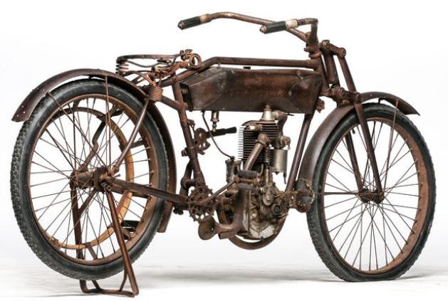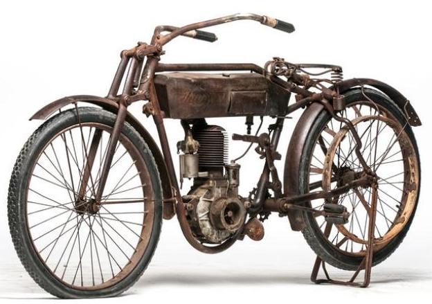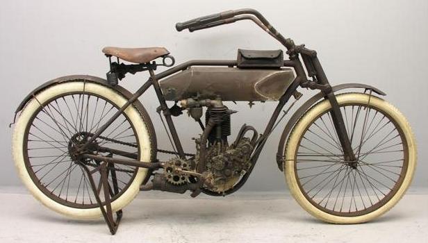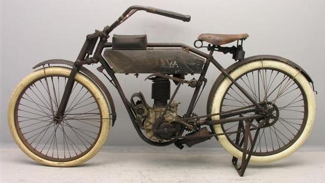 1903-1905 Thor "Camelback", 1-cyl. F-head 13/4hp, 15.85 cu in (259.8cc), bore 219/32", stroke 3", battery ignition, 1-speed, 8...37 mph, $225