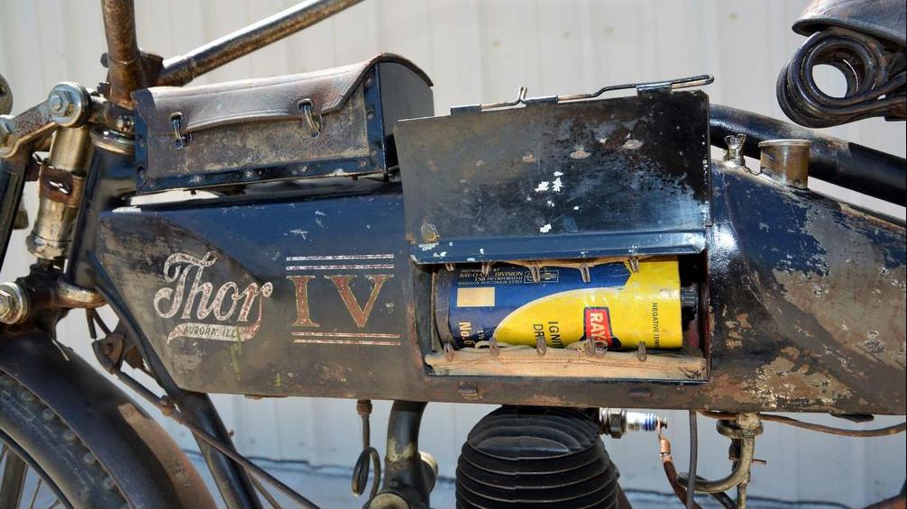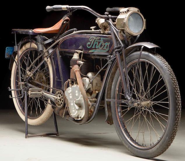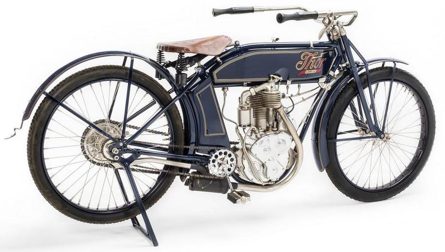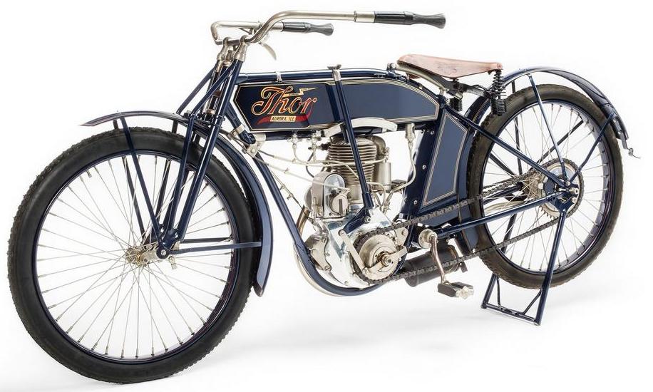 1909 Thor Model B, 1-cyl. F-head 3hp, 19,30 cu. in. (316,3cc), magneto ignition, chain, 1-speed, Aurora spring fork, ? mph, $225