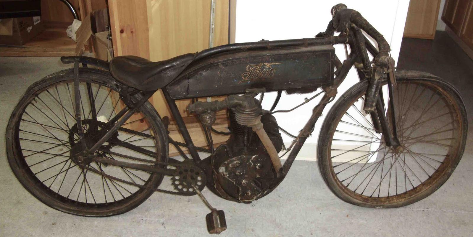 1909 Thor Model D, 1-cyl. F-head 31/4hp, ? cu.in., magneto ignition, chain, 1-speed, Aurora spring fork, ? mph, $250, 95k photo